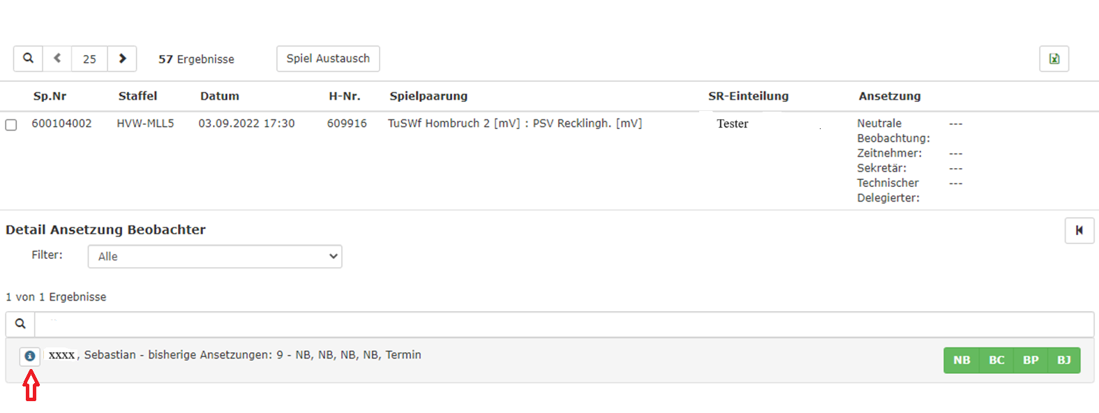 In der dann angezeigten Personenliste findet sich vor dem Namen ein Informationssysmbol (siehe roter Pfeil). Durch Klick auf dieses Symbol, werden alle Termine dieser Person angezeigt. Die grünen Buttons auf der rechten Seite der Personentabelle diener zur Auswahl des Beobachtungstyps.