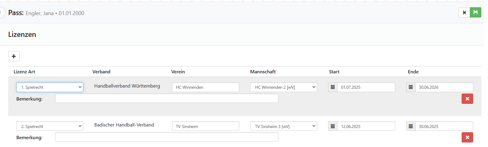 Ein weiterer Button “zum Pass” öffnet den Bildschirm zur Anzeige der beantragten Spiellizenzen. Hier können von Seiten der Passtelle Spielrechte entfernt, hinzugefügt oder auch geändert werden. Zusätzlich lassen sich zu den Spielrechten Bemerkungen hinterlegen.
