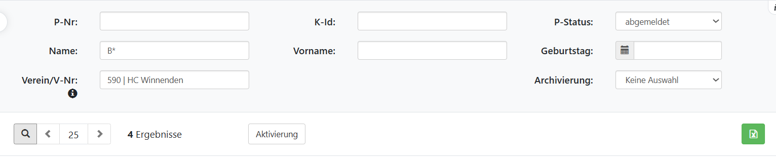 Im Menüpunkt Passarchiv findet man die Passhistorie von Spielern, die mal eine Spielbrechtigung für einen Verein besessen haben (zu anderem Verein gewechselt, aufgehört oder aus sonstigen Gründen archivierte Spieler). Für die Pass-Stellen gibt es hier die Möglichkeit einen archivierten Pass wieder zu reaktivieren. Hierzu steht steht der Button “Aktivierung” oberhalb der Tabelle zur Verfügung.
