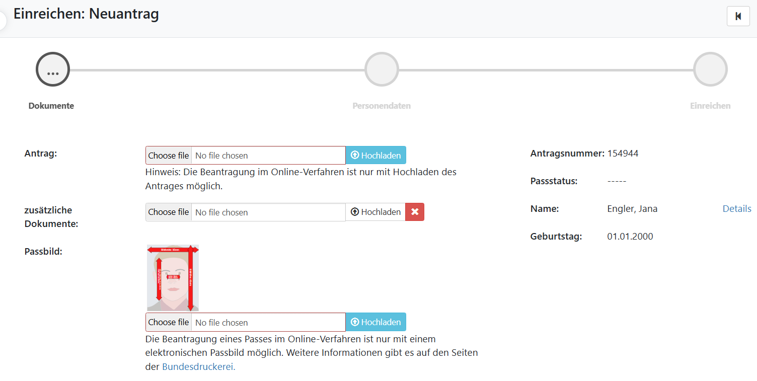 Der nächste Schritt wird erst ermöglicht, wenn die ausgewählten Dokumente (Antrag und Passbild) den Anforderungen entsprechen.