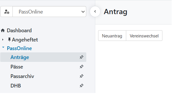 Ausgehend von der Übersichtsmaske der Anträge kann über den Button “Neu” ein neuer Passantrag gestellt werden. Nachdem der “Neu”-Button geklickt wurde, muss zunächst gewählt werden, ob es sich um einen Neuantrag oder um einen Vereinswechsel handelt.