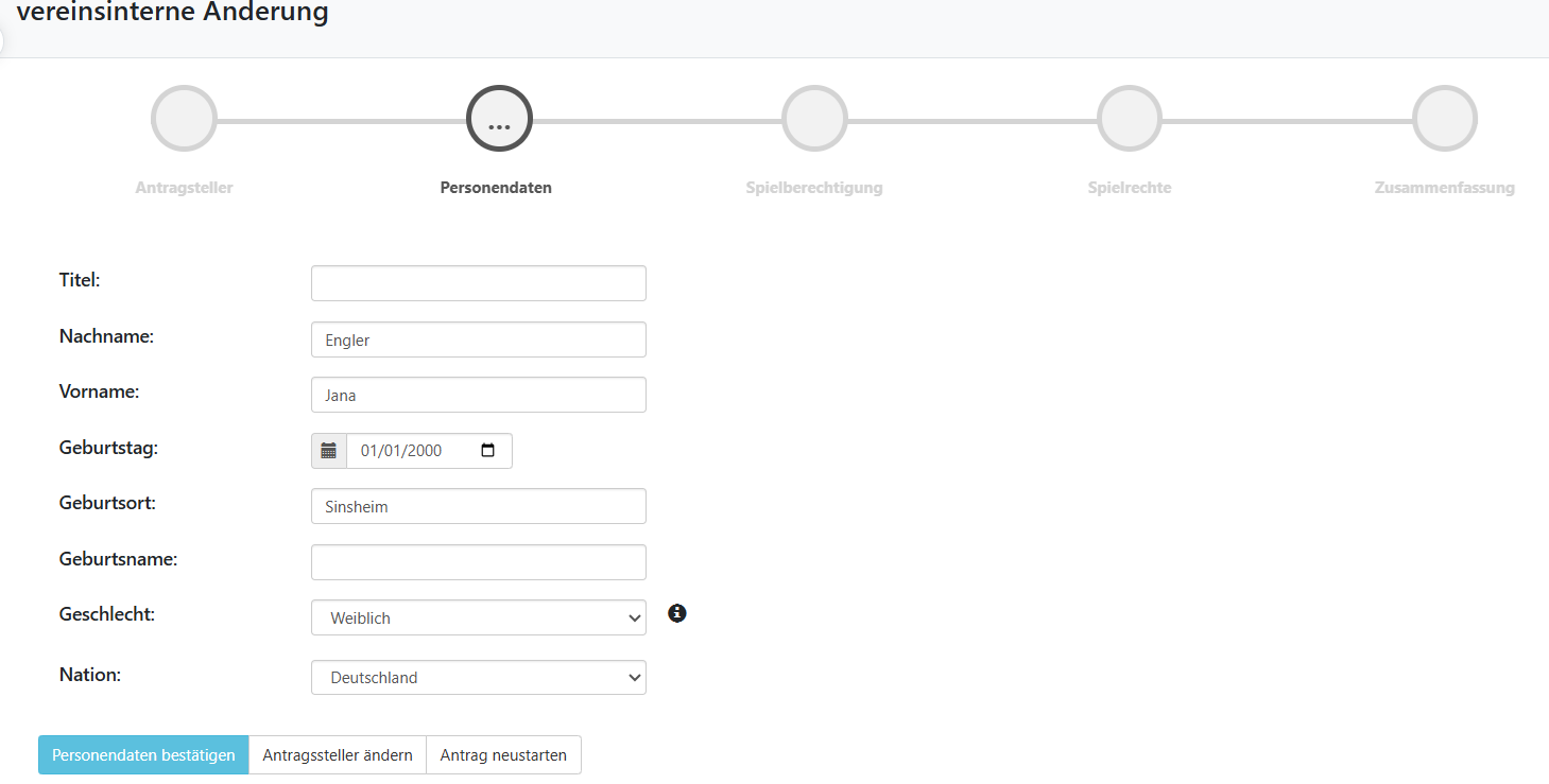 Im zweiten Schritt werden die hinterlegten Personendaten des Spielers angezeigt. Diese können bestätigt werden oder es kann eine Änderung wie z. B. eine Änderung des Nachnamens durchgeführt werden. Spezielle Änderungen wie die Korrektur des Geburtsdatums bedürfen ggf. der Beifügung von entsprechenden Unterlagen.