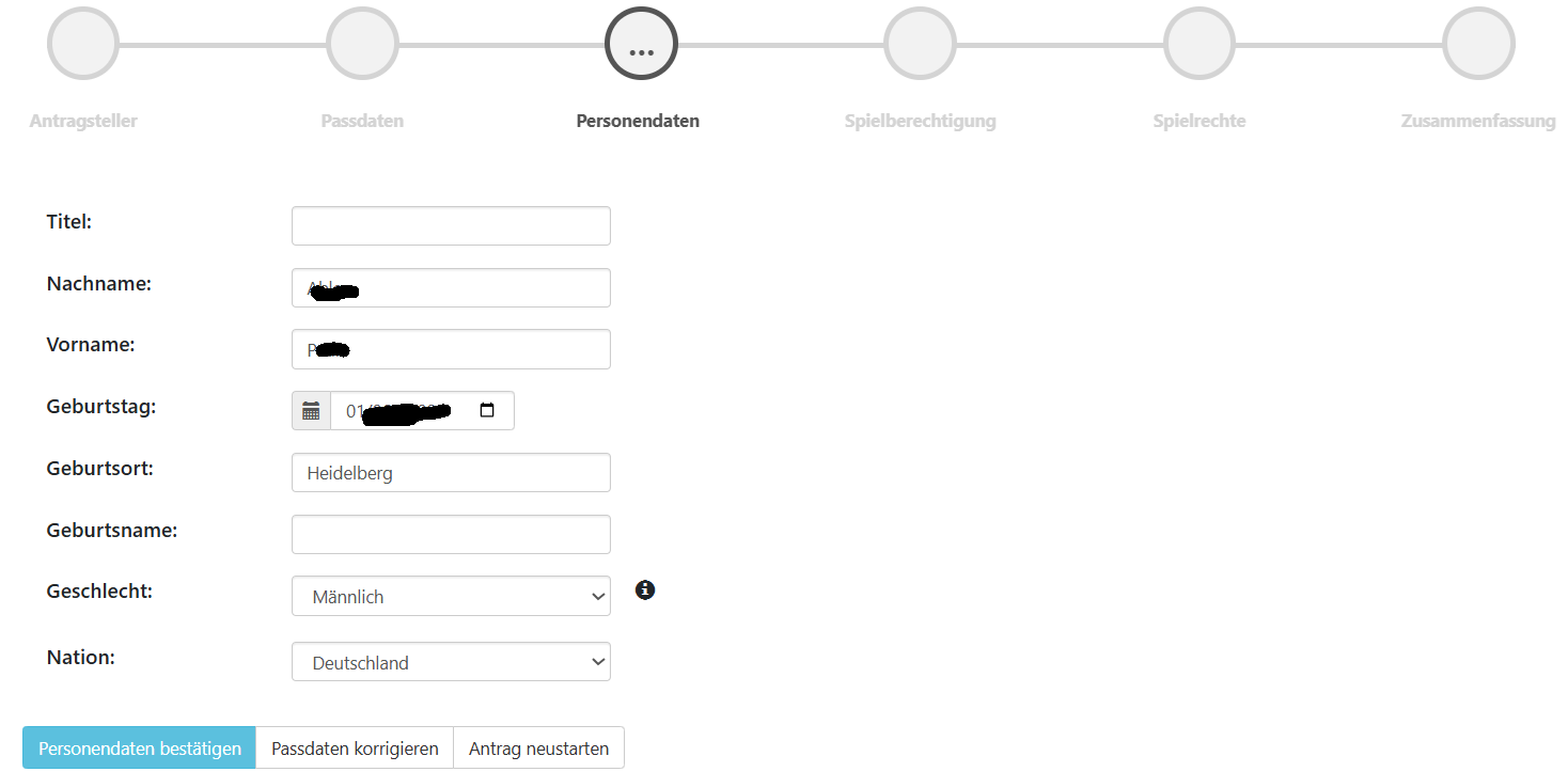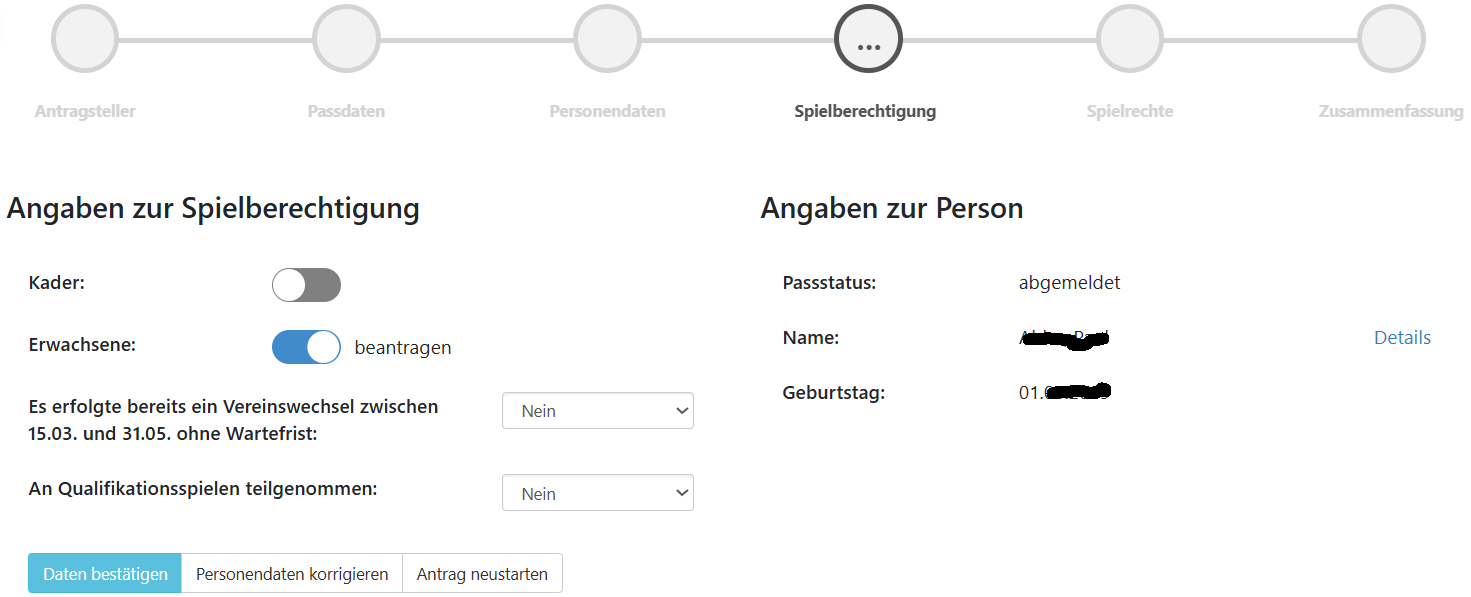 Die Richtigkeit der Personendaten muss über den Button “Personendaten bestätigen” quittiert werden. Damit geht es dann zum nächsten Schritt “Spielberechtigung”.