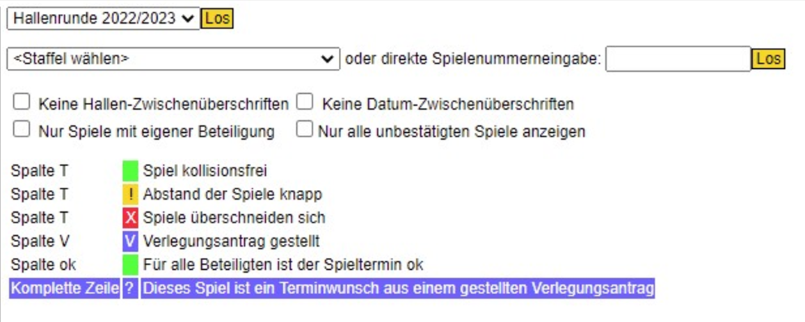 Hier wählt man über den dropdown-Pfeil die entsprechende Saison aus. Klickt man auf den Pfeil im Kasten “Staffel wählen” so kann man “Alle Spiele” oder “Alle Spiele (Erweiterter Modus)” auswählen. Der Unterschied besteht darin, das man im “Erweiterten Modus” noch die Liga / die Ligen auswählen kann die man bearbeiten möchte. Weiterhin kann man, wenn man in mehreren Hallen spielt, sich explizit die Halle aussuchen die man beplanen möchte. Bei jeder Auswahl werden jedoch immer nur die eigenen Spielen angezeigt. Um die Übersicht in der Liste zu vereinfachen, kann man nun auch noch die Hallen-Zwischenüberschriften und die Datums-Zwischenüberschriften ausblenden. Über die direkte Spielnummerneingabe gelangt man zu einem ausgewählten Spiel.