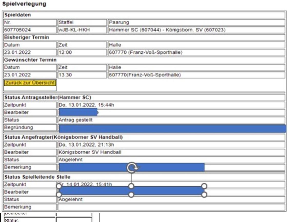 | angenommen | Nach dem Antragsteller hat auch der Gegner bereits zugestimmt. Der Spielplan ist bereits geändert, d.h. das ursprüngliche Spiel ist entfernt und am neuen Termin eingetragen. Es gibt keine Markierung mehr. |