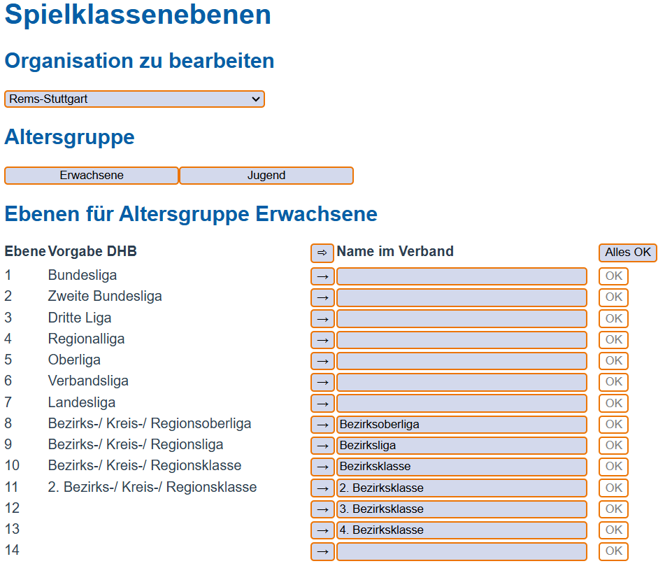 Die Spielklassen müssen fortlaufend angelegt werden. Zwischen den einzelnen Klassen darf keine Klasse leer bleiben. Die Änderungen müssen entweder einzeln mit dem “OK” Button am Ende der Ebenenzeile oder als Gesamtes mit dem “Alles OK” Button bestätigt werden.