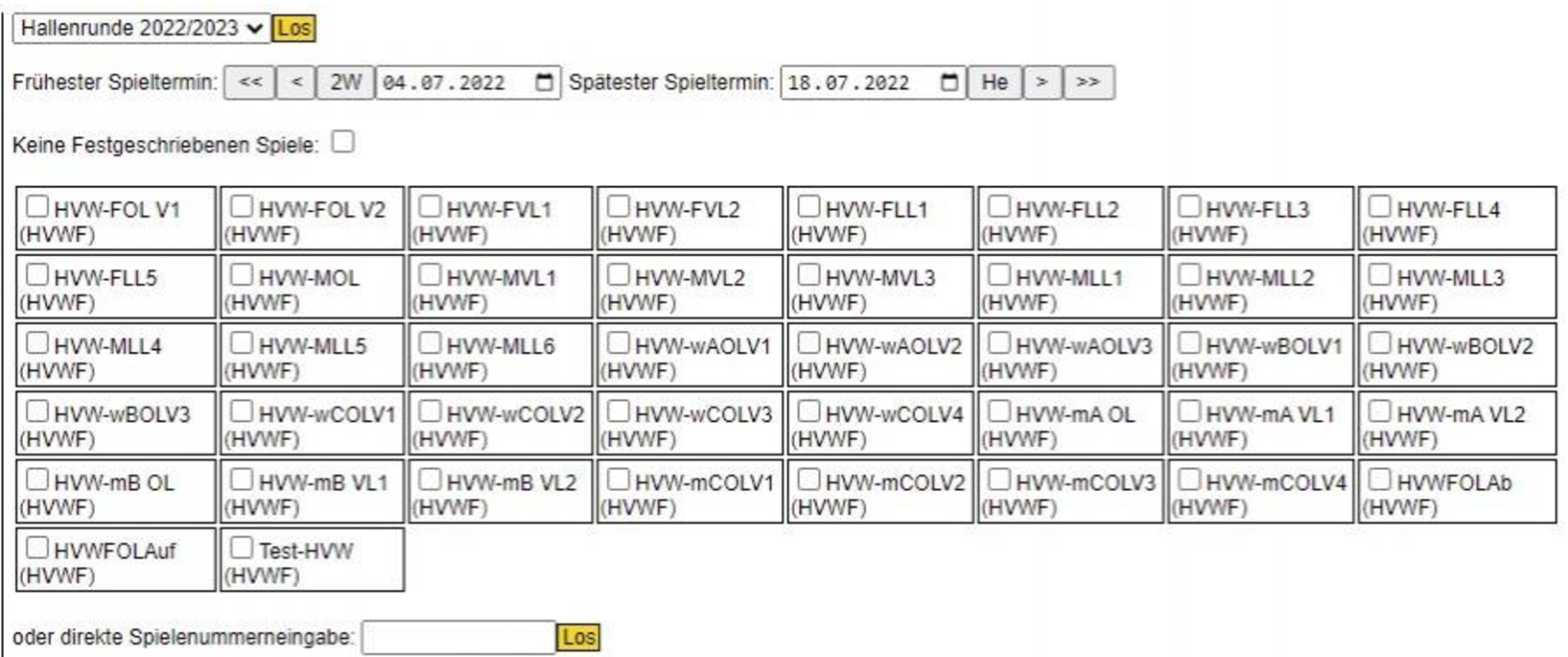 Diese Auswahl, sowie die Auswahl über das Datum, kann man auf einzelne Staffeln begrenzen. Die Auswahl findet statt, indem man in der Staffel jeweils einen Haken setzt. Setzt man diesen, so erscheinen automatisch die Spiele die in dem gewählten Zeitraum in den ausgewählten Staffeln stattgefunden haben. Eine weitere Auswahlmöglichkeit ist die direkte Eingabe der Spielnummer.