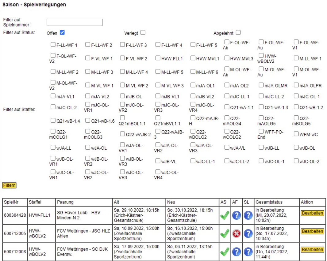 In diesem Menü werden die während der laufenden Saison von den Vereinen geplanten Spielverlegungen seitens der Spielleitenden Stelle bearbeitet.
