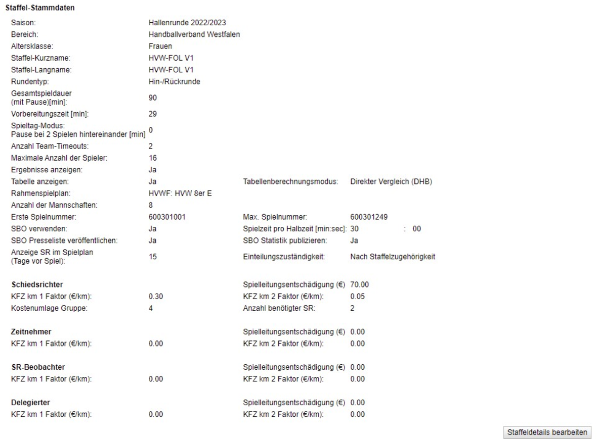 Durch Klick auf den Button bearbeiten wird eine Staffel bearbeitet. Hier können oben zunächst die Stammdaten geändert werden (Button „Staffeldetails bearbeiten“) oder Mannschaften ergänzt (Button „Neue Mannschaft“), bearbeiten (Button „Bearbeiten“ hinter der Mannschaft) oder gelöscht (Button „Löschen“ hinter der Mannschaft) werden.