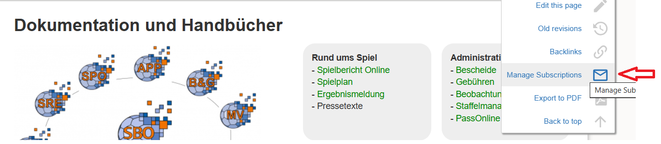 Nachdem der Benutzer für's Wiki registriert wurde und seine E-Mail Adresse hinterlegt ist, kann sich der Benutzer im Wiki anmelden. In der Werkzeuleiste auf der rechten Seite des Wikis findet sich dann der Punkt “Manage Subscriptions”.