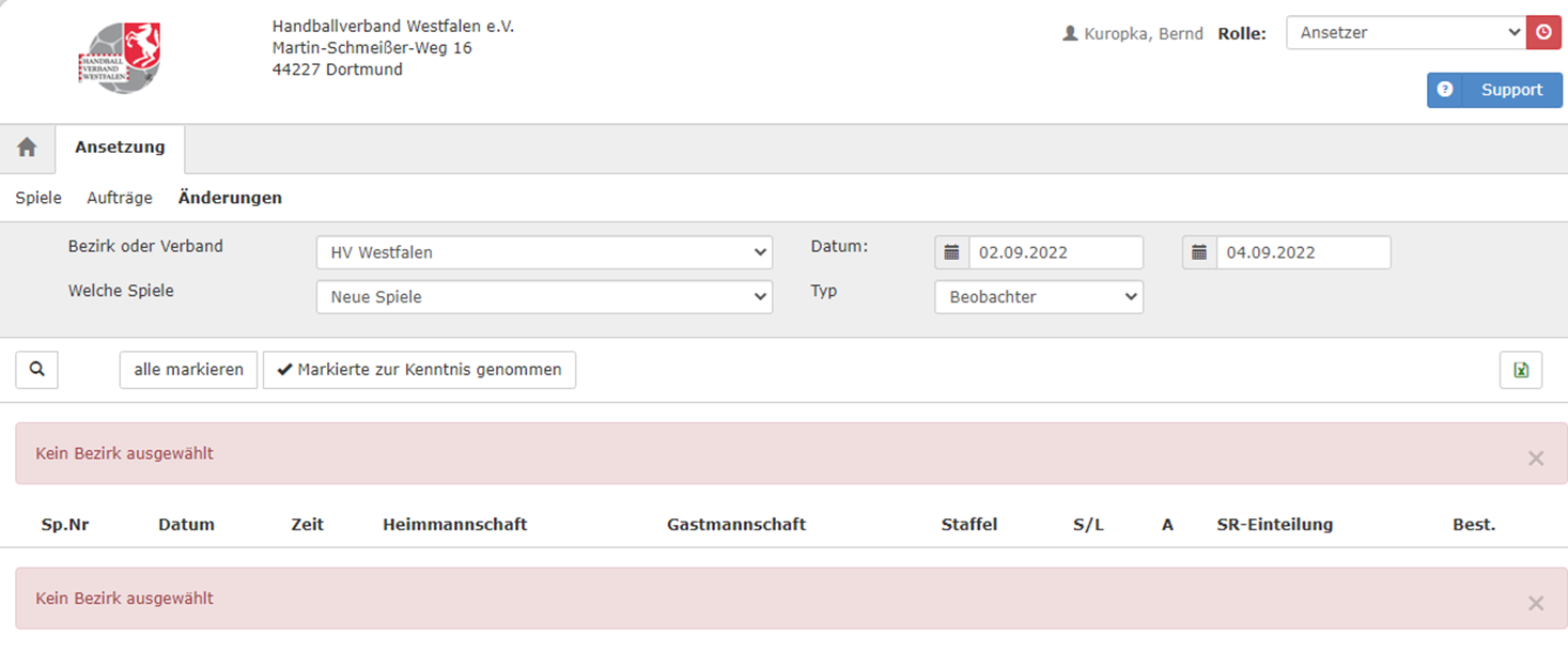 In dem Spiel Austauschfenster kann nun der Verband/Bezirk und der Ansetzungstyp ausgewählt werden.