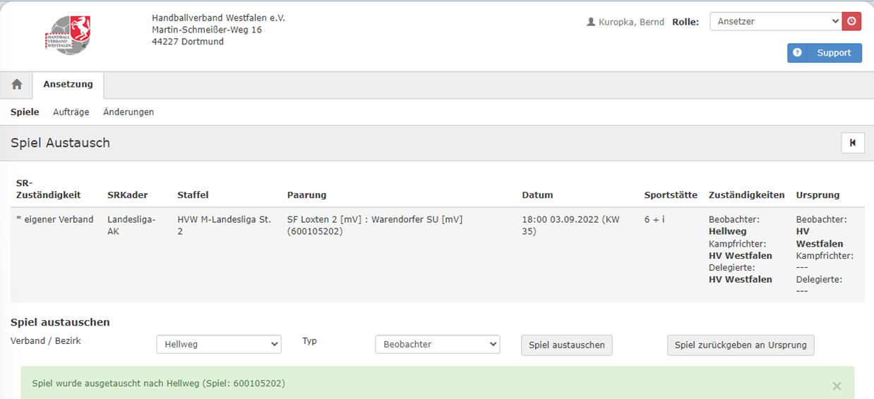 Solange das ausgetauschte Spiel nicht besetzt wurde, kann es über „Spiel zurückgeben an den Ursprung“ zurückgeholt werden.