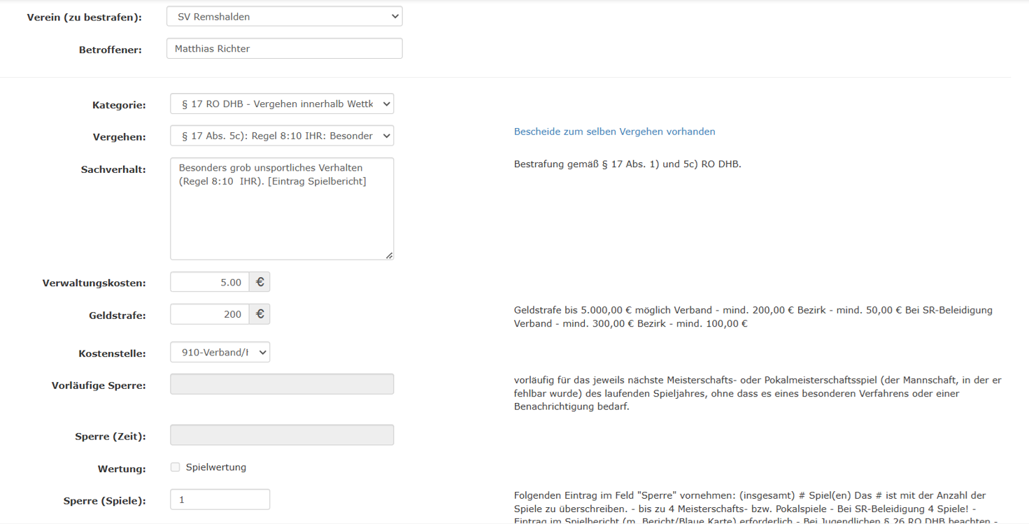 Im weiteren kann nun aus den in der Konfiguration hinterlegten Kategorien und Katalogeinträgen der betreffende ausgewählt werden. Im hier beschriebenen Fall der blauen Karte für eine Spieler sind das die Kategorie $17 RO DHB und der als Vergehen der Katalogeintrag $17 Abs 5c. Anschließend füllt das System automatisch die in der Konfiguration hinterlegten Daten zu den Kosten und Sperren.