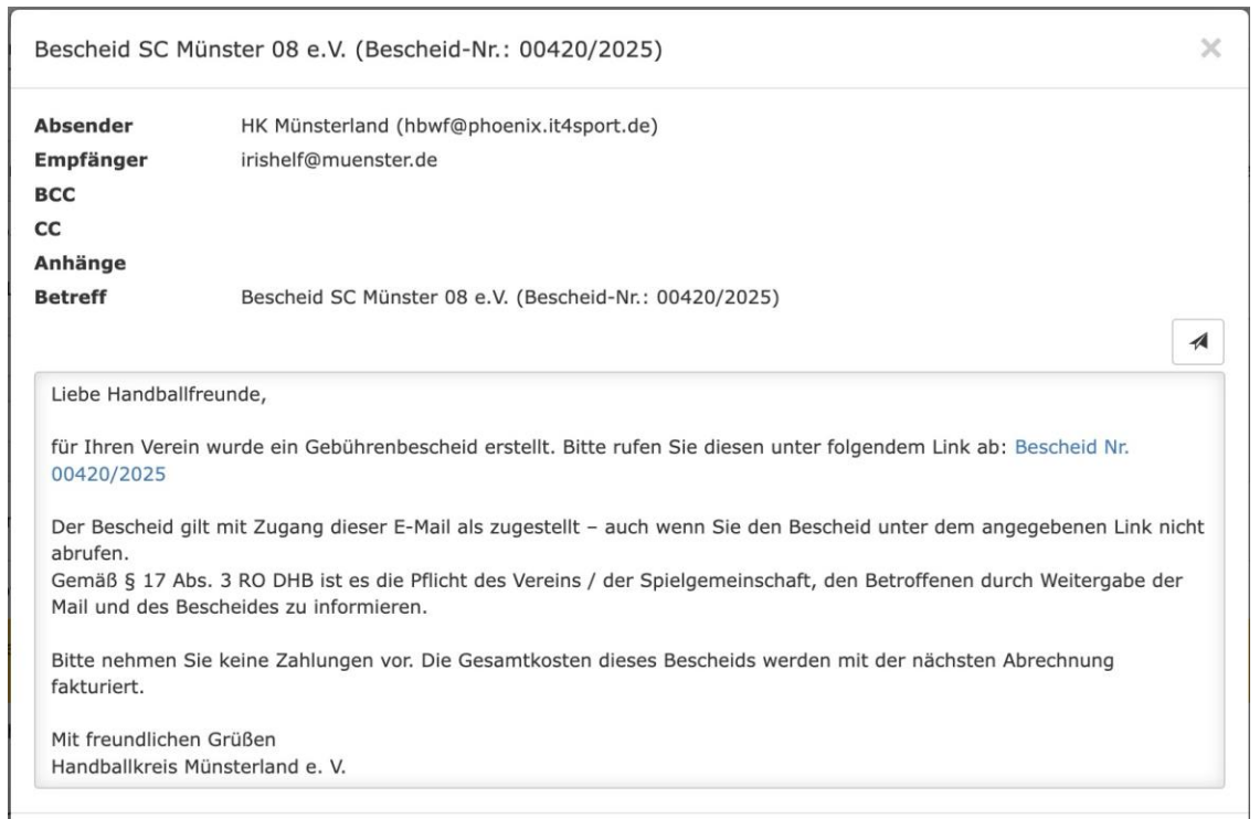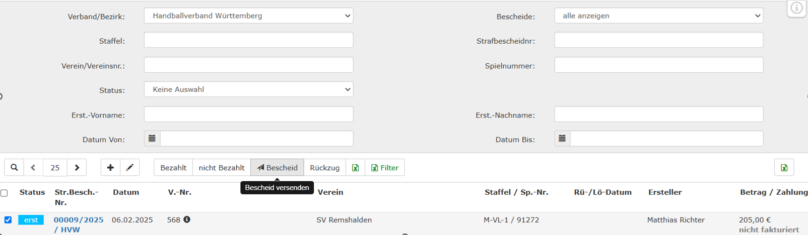 Von hier aus kann der Bescheid markiert und über den Button „Bescheid versenden“ an den betreffenden Verein übermittelt werden.