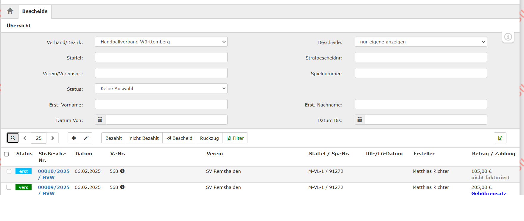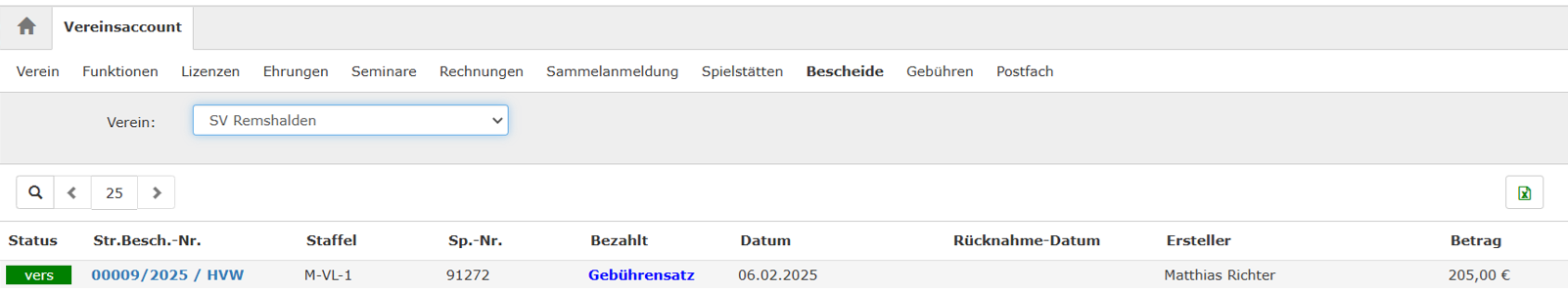 Der Bescheid wurde durch den Statuswechsel automatisch an den Verein übertragen. Im Vereinsaccount kann der Vereinsadmin nun die eingehenden Bescheide in seiner Übersicht sehen und kann dafür sorgen dass der Bescheid bezahlt wird.