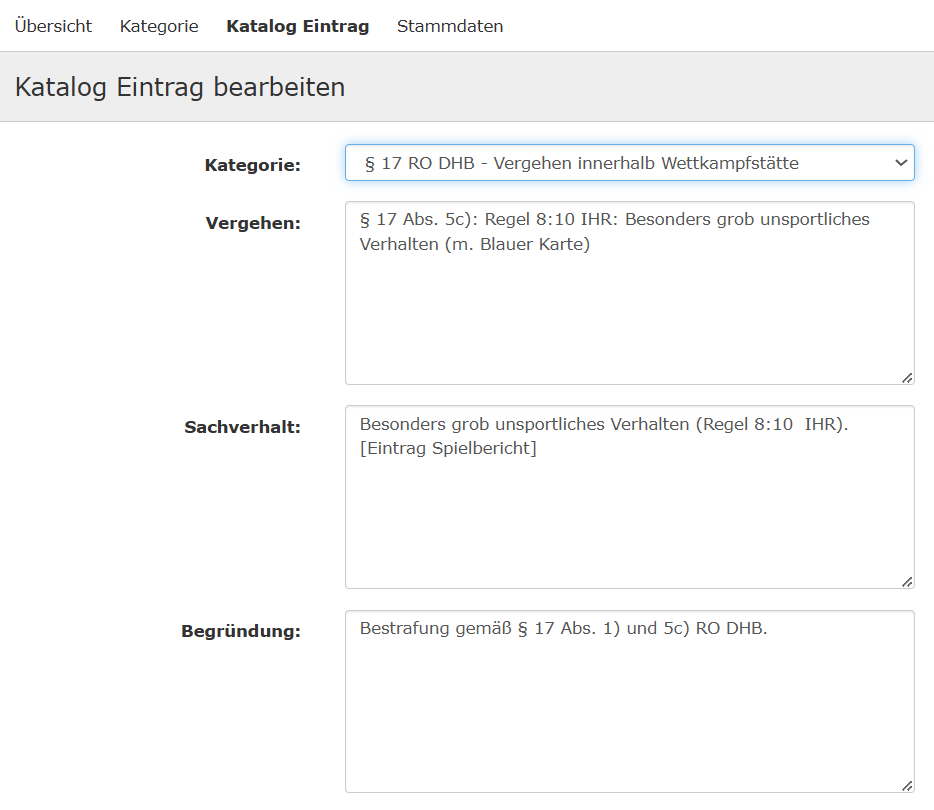 Sofern ein Spieler während des Spiels eine blaue Karte erhält, handelt es sich hier um §17 der Rechtsordnung des DHB (Vergehen innerhalb Wettkampfstätte). Diese Kategorie wird bei Einsatz des Gebührenmoduls bereits vorausgeliefert. Nachdem die Kategorien festgelegt wurden kann jetzt in einem weiteren Schritt der detaillierte Katalog zu den jeweiligen Kategorien hinterlegt werden. Dies erfolgt unter dem Menüpunkt Katalog Eintrag.