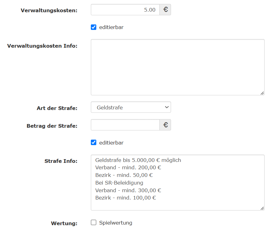 Wie auf den Screenshots zu erkennen, lassen sich bei den hinterlegten Daten zu den Gebühren und der Sperre bereits in der Konfiguration konkrete Werte hinterlegen. Diese können aber auch offen bleiben und können vom Gebührenersteller später je nach Situation und Schwere des Vergehens festgelegt werden. Auf dem Screenshot ist das daran zu erkennen, ob die Checkbox “editierbar” angeklickt ist. Im hier vorliegenden Fall ist der “Betrag der Strafe” und die “Sperre (Spiele)” auf editierbar gestellt. Damit werden diese beiden Attribute vom Ersteller des Gebührenbescheids festgelegt.
