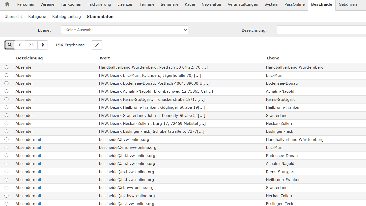Als weitere Konfigurationseinstellung steht der Punkt „Stammdaten zur Verfügung. In diesem Konfigurationsschritt lassen sich Einstellungen in Form von Bezeichnung/Wert/Ebene vornehmen, die den Prozeß einer Bescheiderstellung zum einen standardisieren aber auch den manuellen Aufwand deutlich reduzieren. Hier finden sich beispielsweise Einträge zur Absenderadresse, Ausstellungsort, verschiedene Mailtexte und ähnliches.