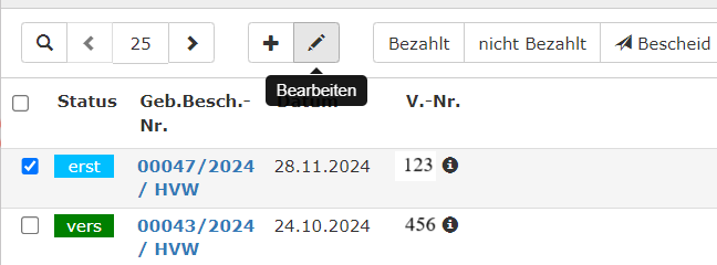 Dazu klickt man in den Kasten zu Beginn der Zeile. Mit einem Klick auf die Geb.Bescheids-Nummer öffnet sich in einem neuen Fenster der Bescheid. Sind in diesem noch Fehler vorhanden, so schließt man das Fenster, markiert erneut die Zeile und klickt auf den Stift (bearbeiten). Danach öffnet sich wieder die Bearbeitungsmaske und es besteht die Möglichkeit den Bescheid zu korrigieren. Nach der Korrektur ist das Speichern nicht zu vergessen.