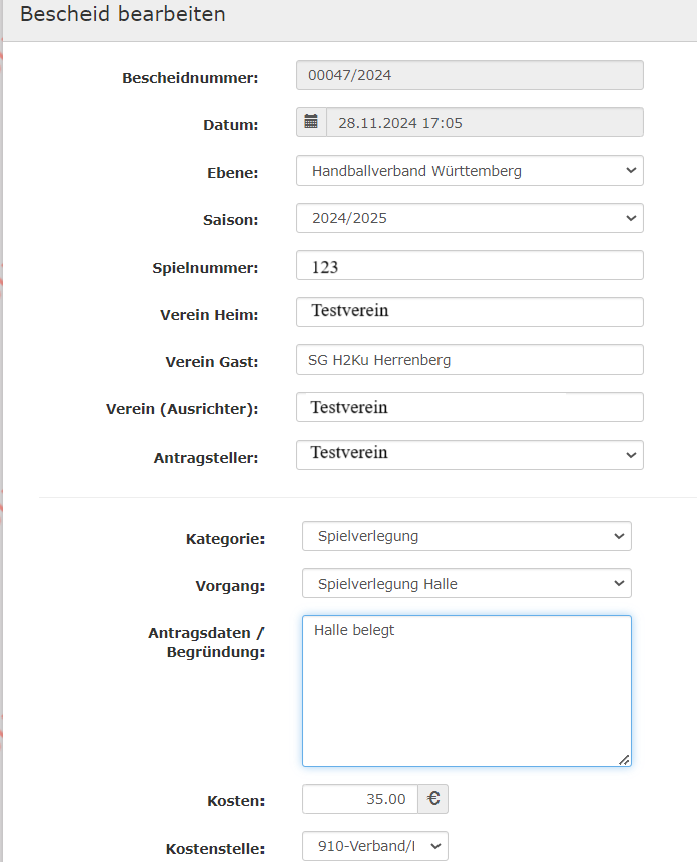 | Versendung | der Bescheid ist erstellt und an den Verein versendet |