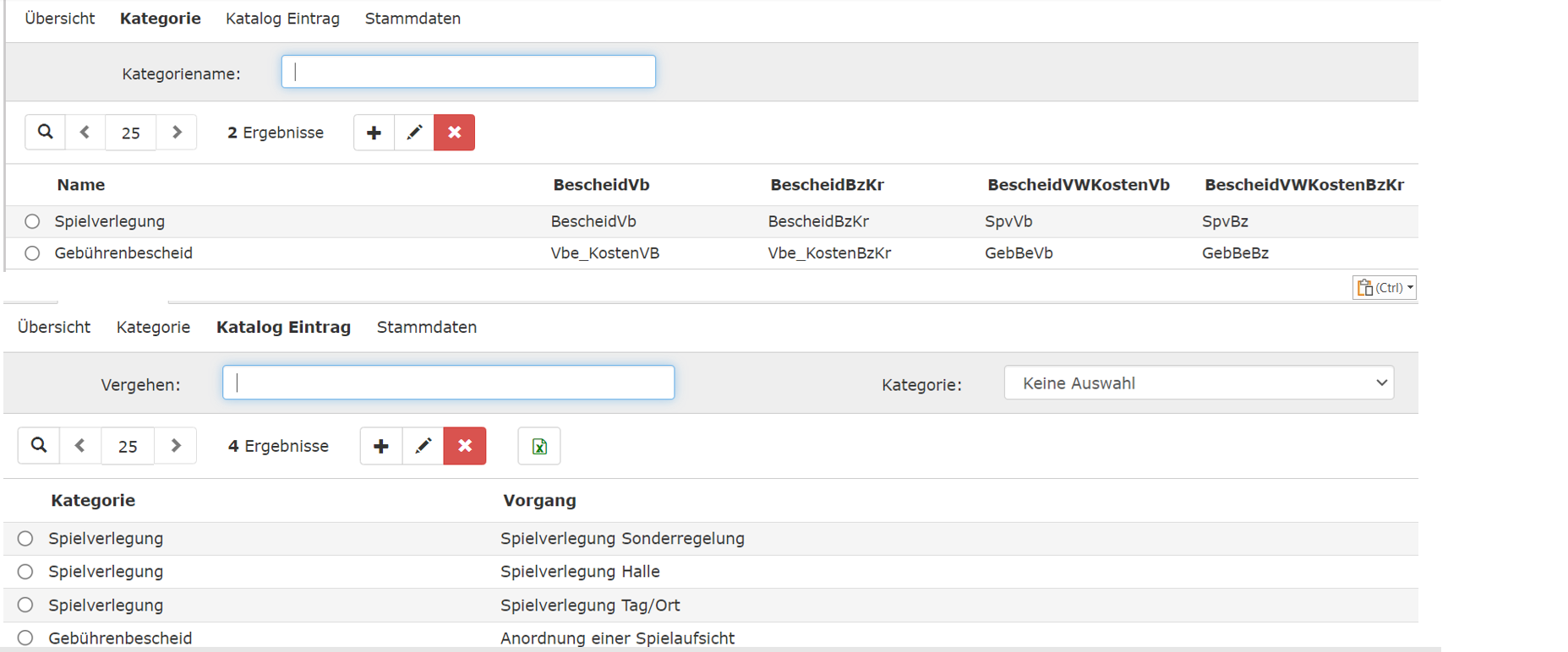 Grundvoraussetzung für die Erstellung von Gebühren ist es, dass über die Rolle “KreisAccount” die nötigen Voraussetzungen geschaffen werden. Diese bestehen in der Anlage von Kategorien und den Katalog Einträgen. Aus diesen zwei Faktoren zieht das Programm die nötigen Daten (Kosten, Rechtsgrundlagen). Zu den Gebühren zählen beispielsweise Mitgliedsbeiträge für die Mannschaften im Verband, Ausstellungen von Lizenzen, Passgebühten usw. Die Höhe der Gebühren ist in der Regel in den Satzungen der Verbände geregelt. In dem beigefügten Screenshot sind einige eingetragene Daten ersichtlich.