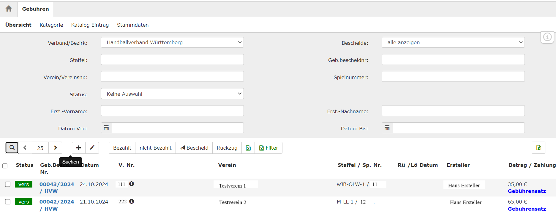 Im oberen Bereich der Maske gibt es verschiedene Möglichkeiten einen Gebührenbescheid zu suchen. Wobei die Suche jedes Mal über das Anklicken der Lupe gestartet wird. Auch hier kann man die Zahl der nach der ausgeführten Suche anzuzeigenden Ergebnisse durch die Änderung der Zahl “25” beeinflussen.