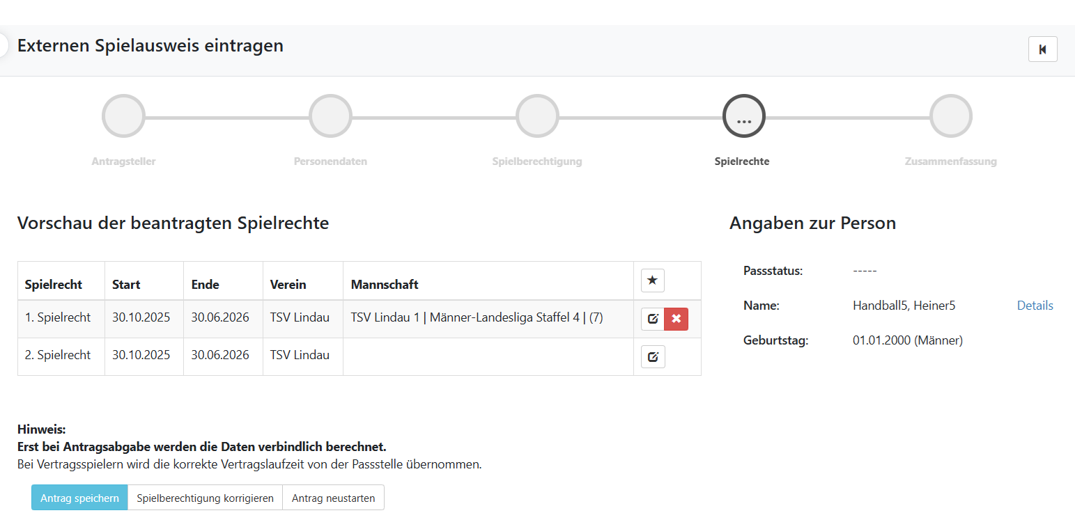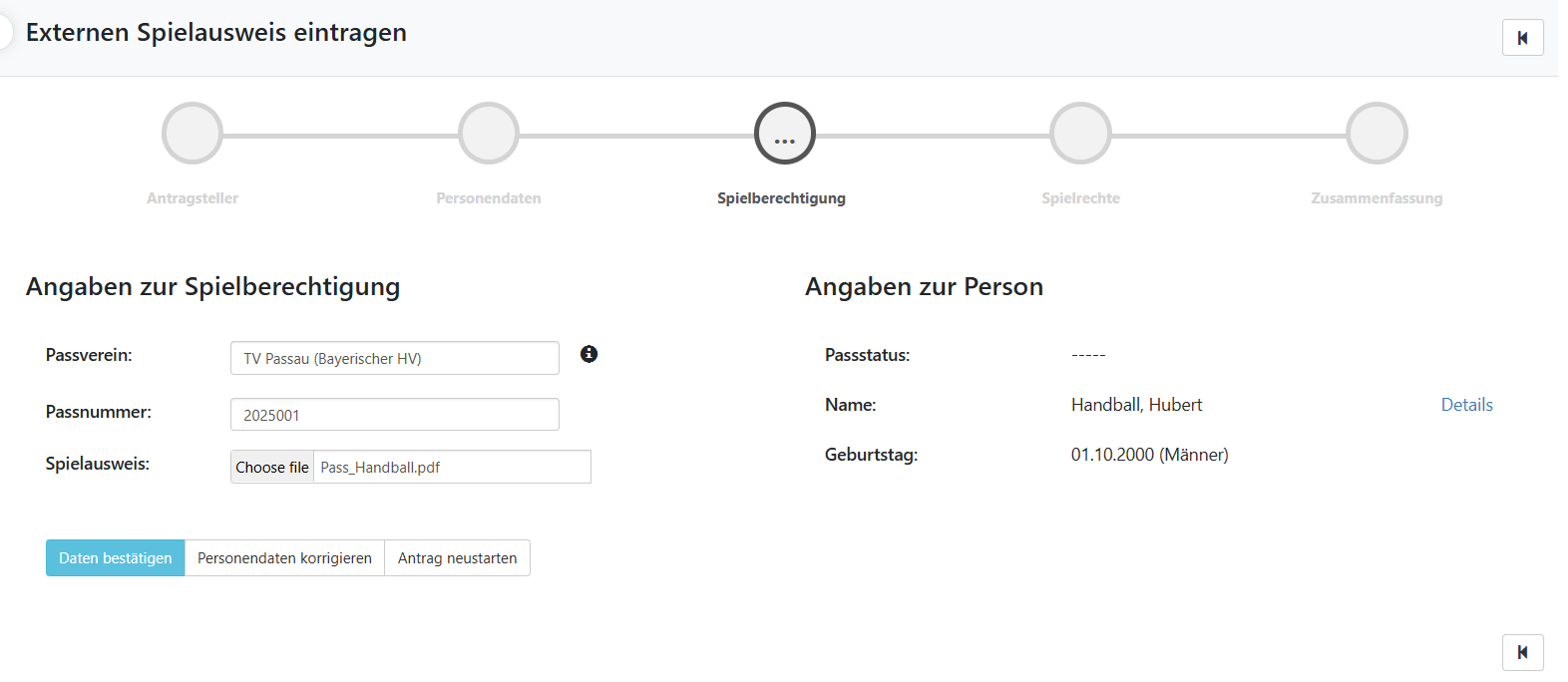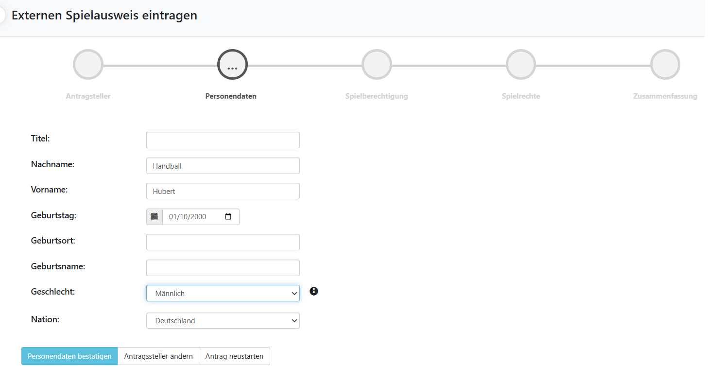 Anschließend klickt man den Button “Personendaten bestätigen” und gelangt zum nächsten Prozessschritt, der Datenerfassung zu den Spielberechtigungen.
