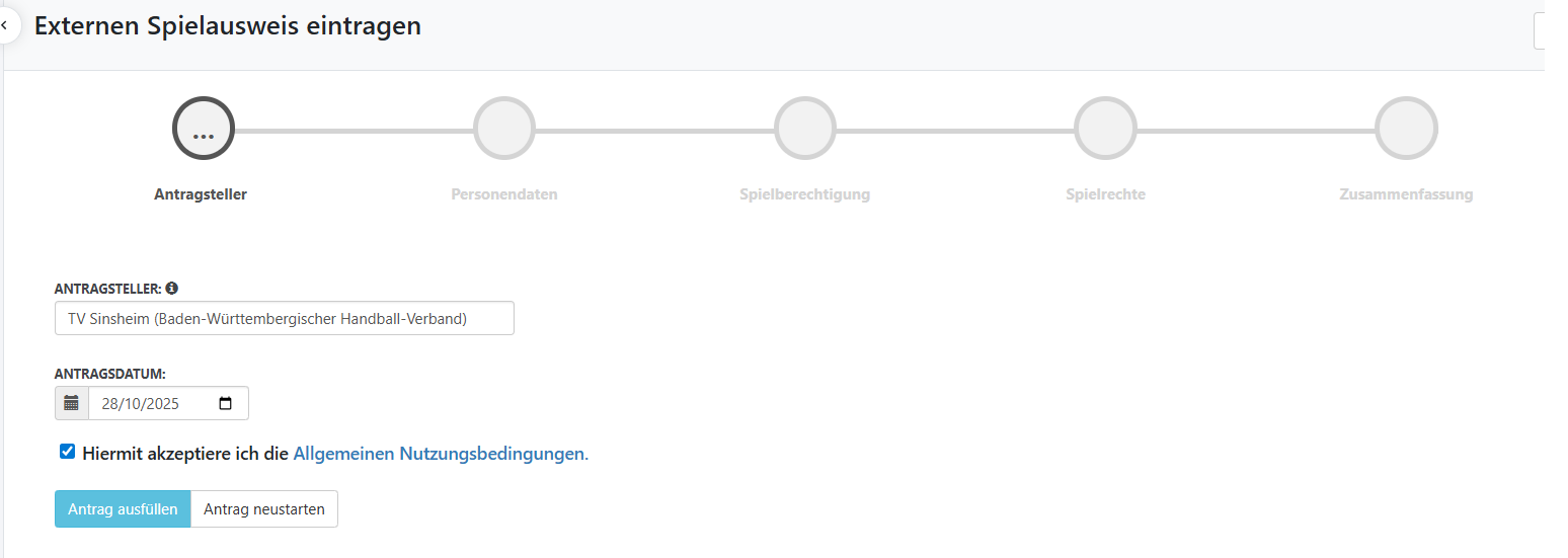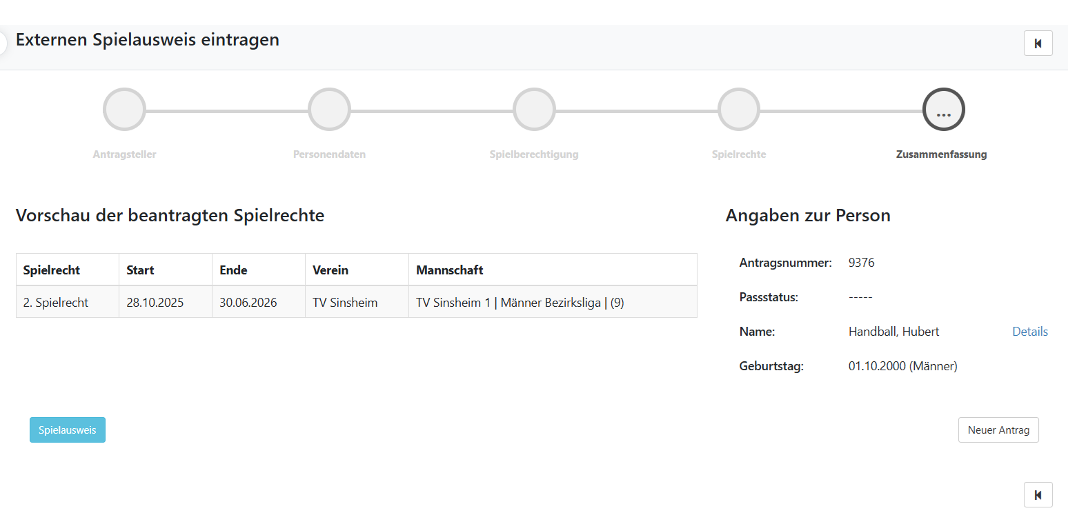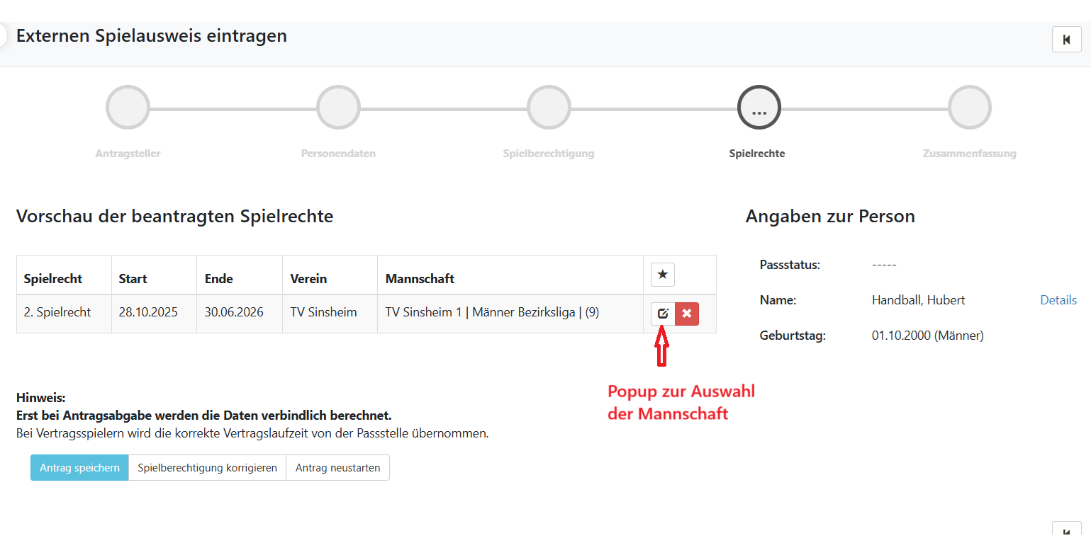 Anschließend klickt man den Button “Personendaten bestätigen” und gelangt zum nächsten Prozessschritt, der Datenerfassung zu den Spielberechtigungen.