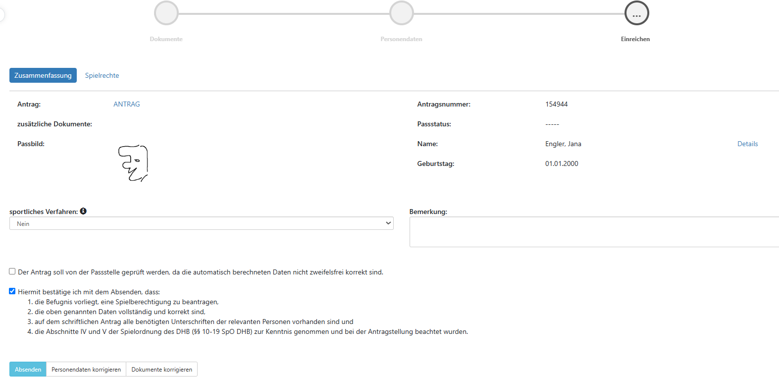 Es öffnet sich nun der Bildschirm “Einreichen”. Von hier aus gibt es die Möglichkeit nochmals alle Personendaten oder hochgeladenen Dokumente zu überprüfen und ggf. zu korrigieren. Ebenfalls muss die Angabe erfolgen, auf wessen Rechnung die Fakturierung der Passgebühren (Spielgemeinschaft/Stammverein) erfolgen soll. Dies gilt nicht für alle Verbände, nähere Auskünfte sind beim jeweiligen Verband verfügbar.