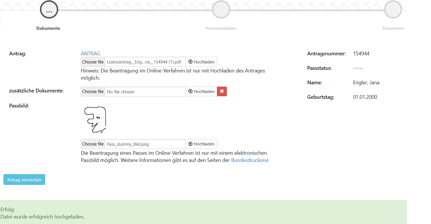 Nachdem die Datei des unterschriebenen Antrages und das Passbild hochgeladen wurden, gelangt man über den Button “Antrag einreichen” weiter.