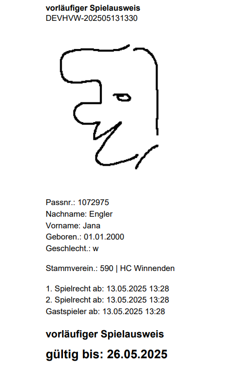 Nach dem Klick auf “Absenden”, stellt das System in der Regel einen vorläufigen Spielausweis bereit, der abgespeichert und ausgedruckt werden kann. Dieser Spielausweis ist nur begrenzt (meist 14 Tage) gültig. Die Vorlage kann auch als Nachweis für das Vorhandensein einer Spielberechtigung verwendet werden (gilt nicht für 3. Liga).