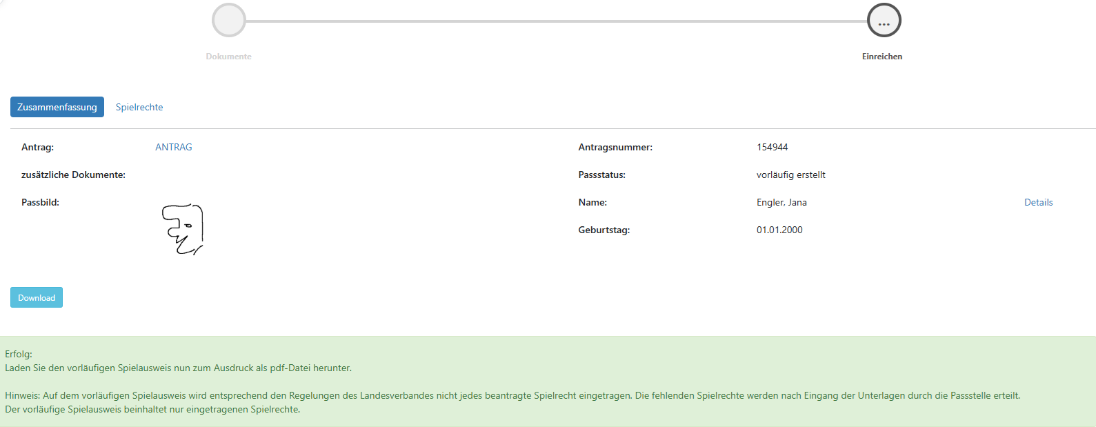 Sind alle Voraussetzungen erfüllt, kann der Antrag über den Button “Absenden” an die zuständige PassStelle übermittelt werden. Nach Klick auf den “Absenden” Button wird noch eine Zusammenfassung der Antragsdaten angezeigt und es besteht die Möglichkeit einen vorläufigen Spielausweis herunterzuladen und auszudrucken.