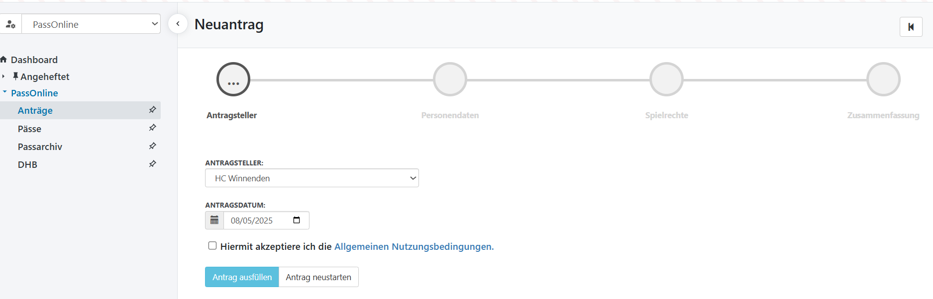 Neben dem Antragssteller (der Verein welcher den Antrag stellt) und dem Antragsdatum, muss der Vereinsbearbeiter die Nutzungsbedingungen des Verbandes akzeptieren.