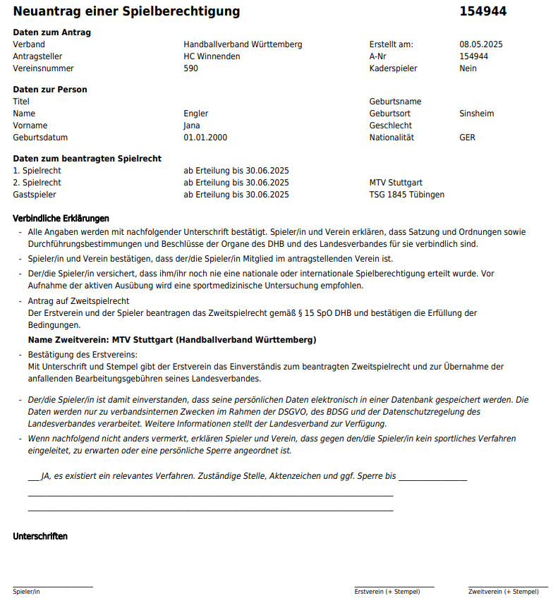 Auf dem generierten Antrag müssen alle erforderlichen Unterschriften und Stempel eingeholt werden. Welche dies sind, können dem gedruckten Antrag entnommen werden. Der Antrag sollte abgespeichert werden, kann dem Spieler oder den Personensorgeberechtigten per Mail übermittelt werden. Alle Unterschriften müssen jedoch vor Beantragung der endgültigen Spielberechtigung auf dem Originaldokument (Papier) vorliegen.