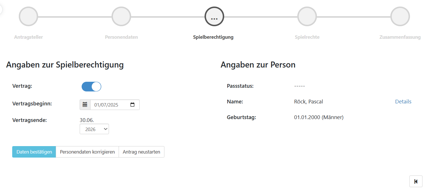 Sofern ein Spieler einen Vertrag erhalten soll, müssen die Vertragsdaten hier unter dem Prozessschritt “Spielberechtigung” hinterlegt werden.