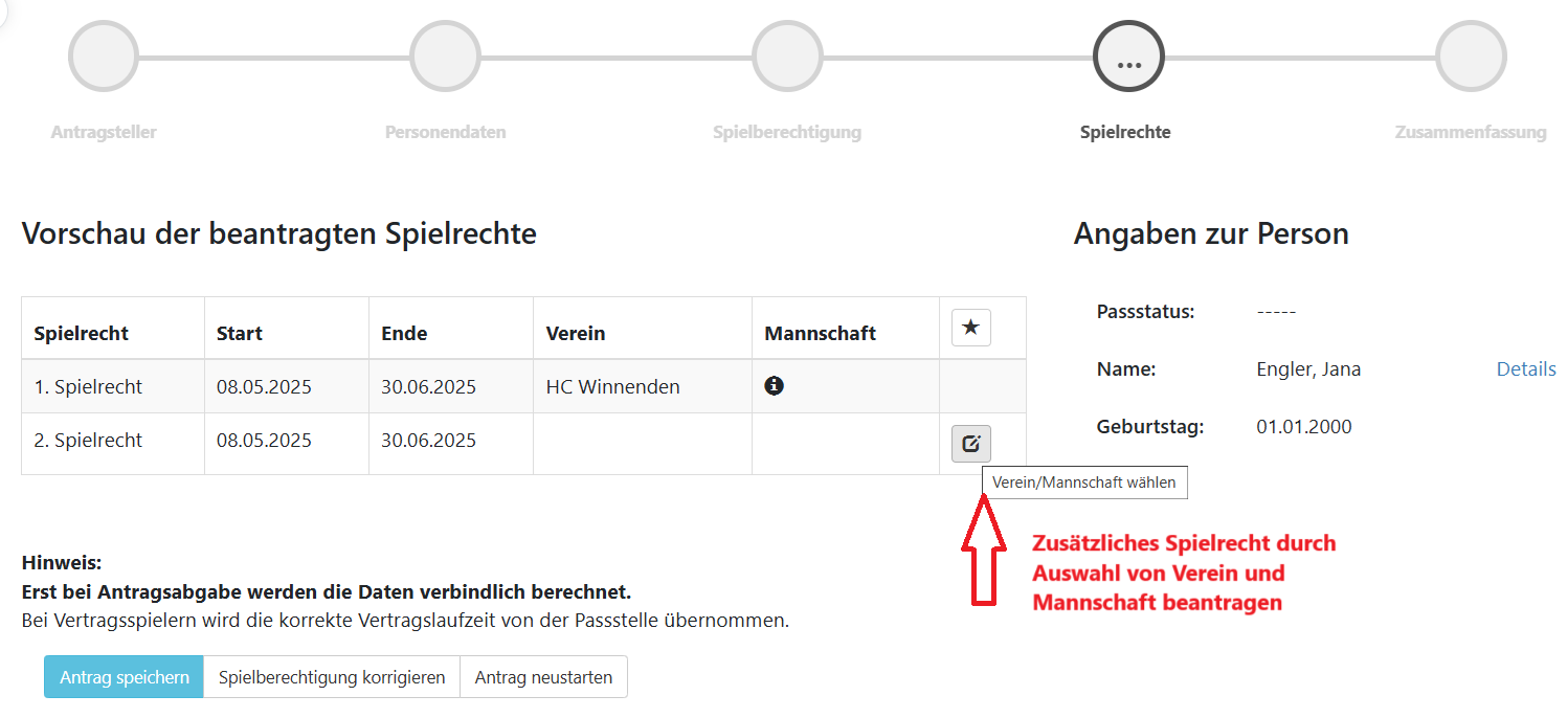Mit Klick auf Antrag speichern wird die Angabe zum Erstspielrecht und falls Verein und Mannschaft für das Zweitspielrecht eingetragen wurden, auch diese gespeichert.