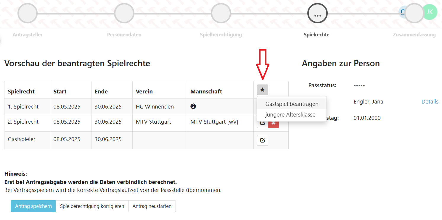 Mit Klick auf den “Stern”-Button kann man das Spielrecht für Gastspiele gemäß §73 SpO DHB (Freundschaftsspiele für einen anderen Verein ohne Vorliegen eines Spielrechtes für diesen) oder das Spielrecht für eine jüngere Altersklasse als die eigene beantragen. Das Spielrecht für eine jüngere Altersklasse darf dabei nur unter besonderen Umständen, z. B. bei ärztlich bestätigten physischen oder psychischen Einschränkungen, beantragt werden. Hierzu sind die Voraussetzungen des jeweiligen Verbandes zu berücksichtigen.