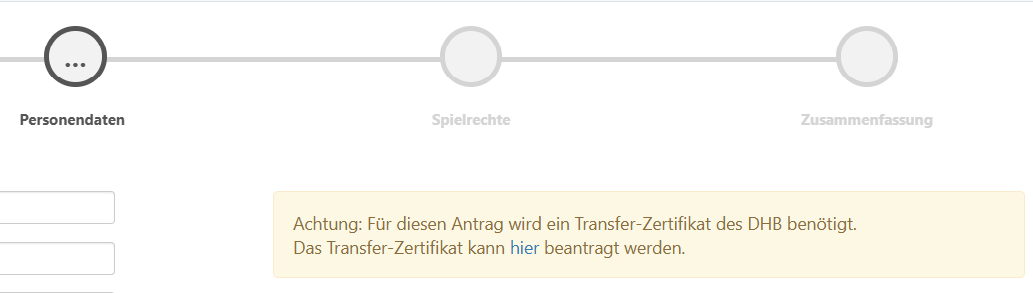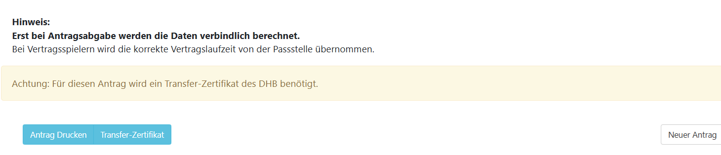 Sofern es sich bei dem Neuantrag um einen Spieler aus einem anderen Internationalen Verband handelt, wird wie bereits unter den Personendaten beschrieben, ein Transferzertifikat benötigt. In diesem Fall steht am unteren Bildschirmrand der Button “Transfer-Zertifikat” zur Verfügung. Ein Klick auf den Button führt den Benutzer zu den Seiten des DHB, um online den Antrag auf internationalen Verbandswechsel zu starten.