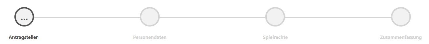 Nach Klick auf “Neuantrag” öffnet sich der erste Schritt und die Daten zum Punkt “Antragsteller” müssen hier eingegeben werden. Der Neuantrag eines Spielausweises besteht aus den Unteraktivitäten Antragsteller, Personendaten, (Spielberechtigung), Spielrechte und einer Zusammenfassung. Die vorhandenen Unteraktivitäten und der Zustand, auf welcher Unteraktivität man sich gerade befindet, wird durch eine Prozessleiste am oberen Bildschirmrand angezeigt.