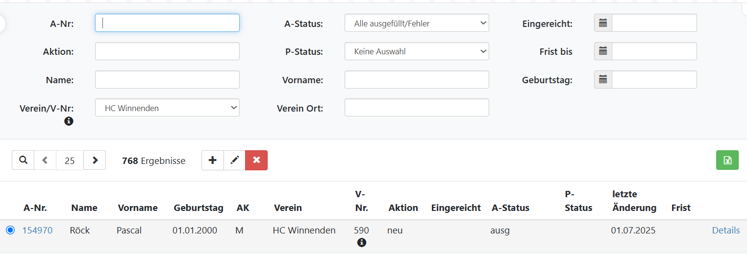 Im oberen Bereich des Bildschirms lassen sich die Anträge nach verschiedenen Kriterien filtern. Die Treffer werden in einer Tabelle im unteren Bereich angezeigt. In der zweiten Spalte (neben der Markierspalte) findet sich die Antragsnummer (A-Nr.). Durch Klick auf die Antragsnummer öffnet sich ein Fenster und der Antrag wird angezeigt und kann heruntergeladen werden. Auf der rechten Seite der Tabelle gibt es die Spalte “Details”. Durch Klick werden die detaillierten Antragsdaten angezeigt.