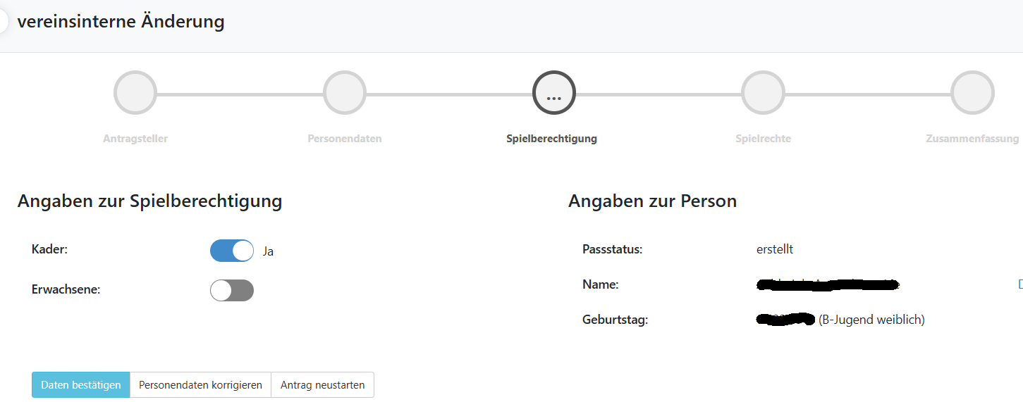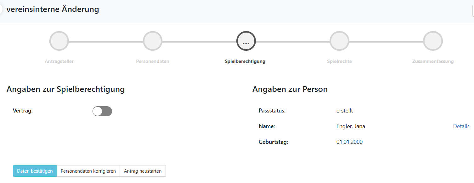 Im zweiten Schritt werden die hinterlegten Personendaten des Spielers angezeigt. Diese können bestätigt werden oder es kann eine Änderung wie z. B. eine Änderung des Nachnamens durchgeführt werden. Spezielle Änderungen wie die Korrektur des Geburtsdatums bedürfen ggf. der Beifügung von entsprechenden Unterlagen.