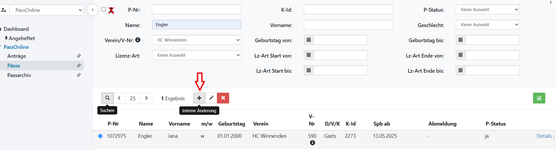 Anträge auf vereinsinterne Änderungen werden ausgehend vom Menüpunkt “Pässe” erstellt. Nach Auswahl des Passes/Person für welche eine Änderung beantragt werden soll, startet man den Vorgang durch Klick auf den Button “+”. (siehe Screenshot)