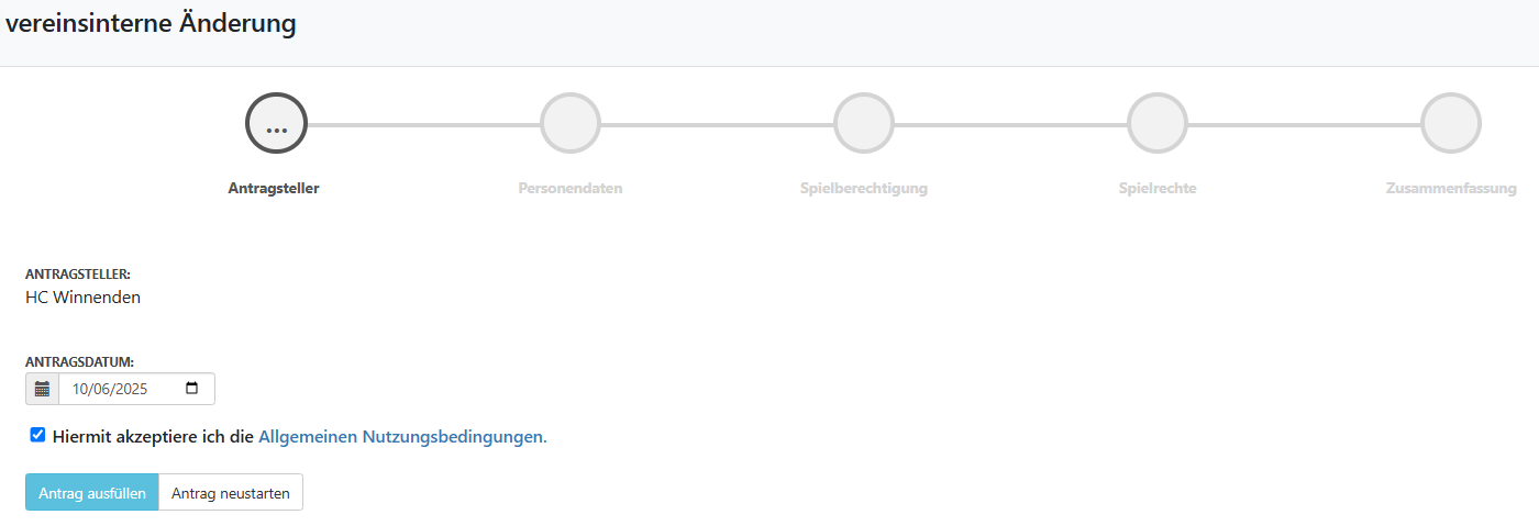 Soll die Spielberechtigung eines abgemeldeten Spielers, der den Verein nicht verlassen hat, reaktiviert werden, sollen die Personendaten geändert werden oder soll ein Spieler des eigenen Vereins ein weiteres Spielrecht erhalten, so ist es erforderlich, einen Antrag auf vereinsinterne Änderung zu stellen.