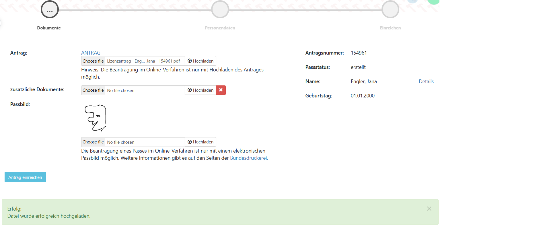 Da bei vereinsinternen Änderungen in der Regel bereits ein Passbild vorliegt, reicht es aus, den mit den notwendigen Unterschriften versehenen Antrag hochzuladen. Dennoch wird empfohlen, mit jedem Antrag das aktuelle Passbild neu einzureichen.