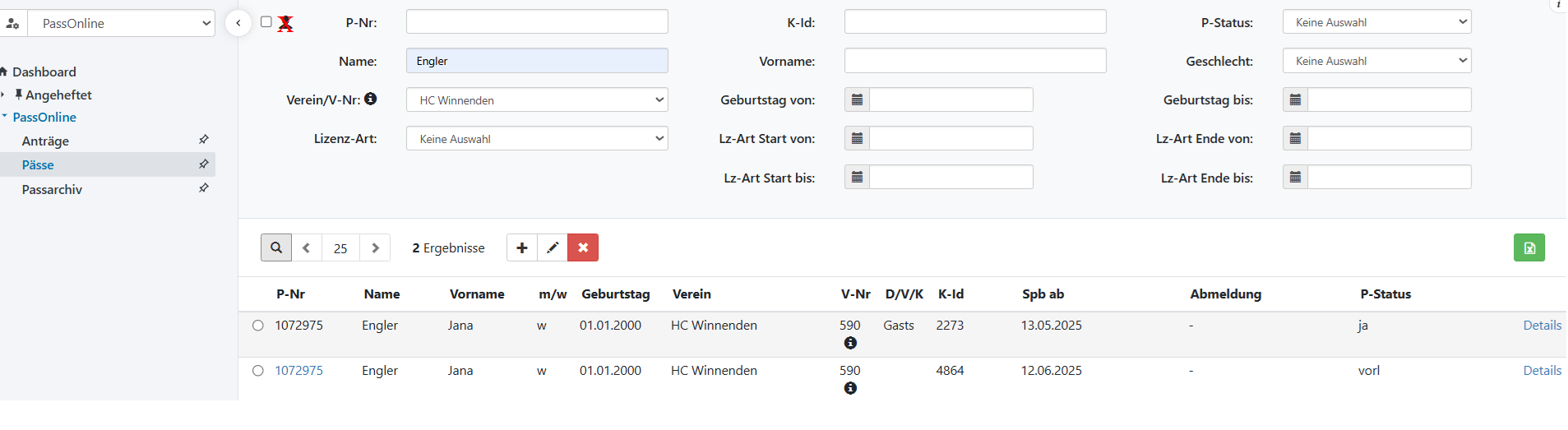 In der Passübersicht sind nun beide Spielausweise sichtbar. Der alte, bereits vorhandene, und der vorläufige, der durch den neuen eingereichten Antrag erzeugt wurde.