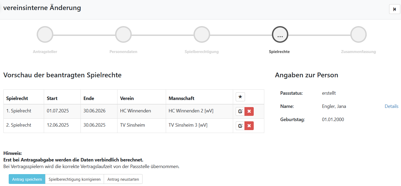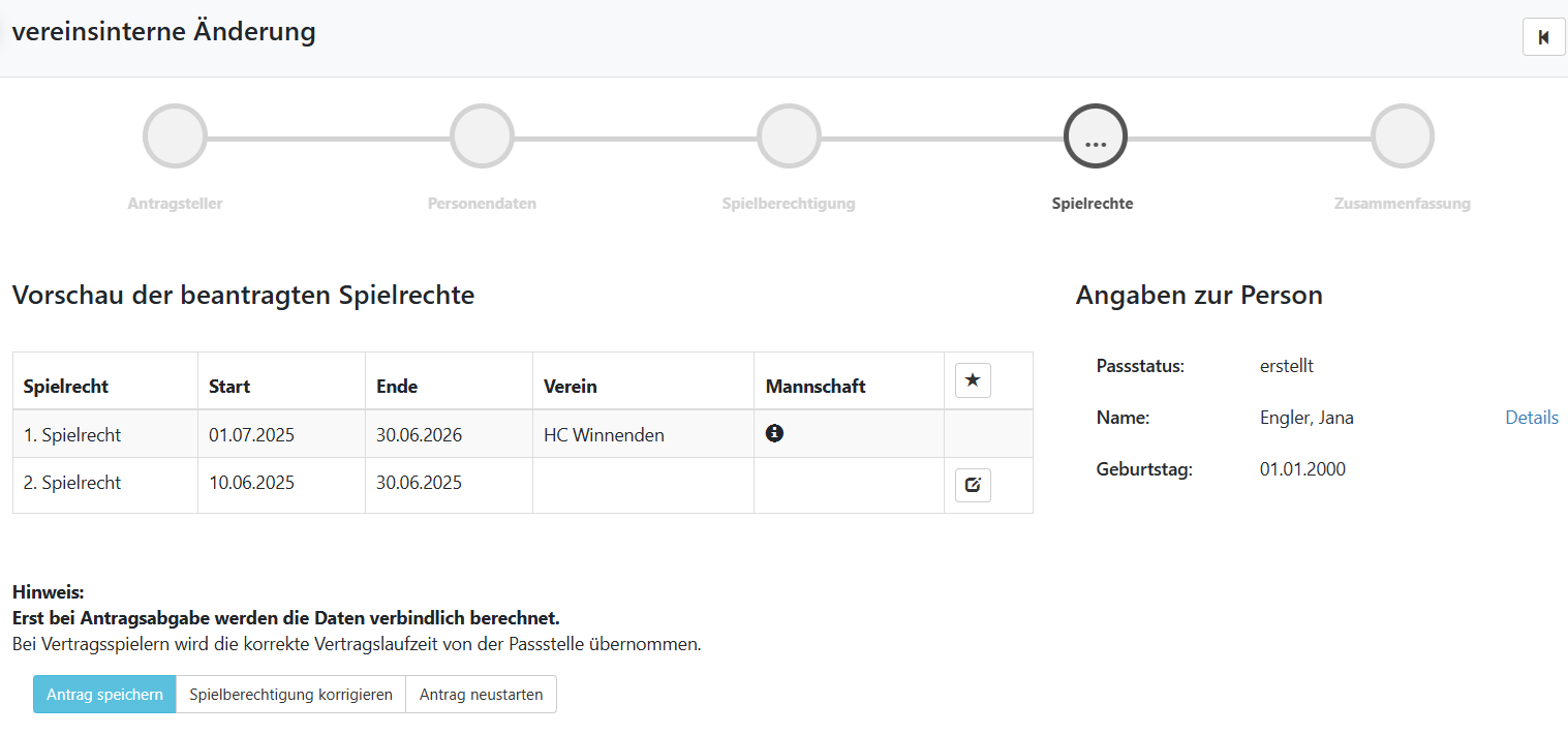 Im nächsten Prozessschritt zu den vereinsinternen Änderungen werden die vorhandenen Spielrechte des Spielers angezeigt. Hier können nun Änderungen an den Spielrechten, wie z. B. die Beantragung weiterer Spielrechte, vorgenommen werden. Eine detaillierte Beschreibung zur Funktionsweise dieses Bildschirms findet sich unter Spielrechte beantragen.