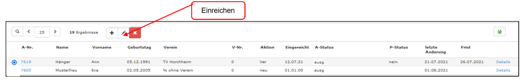 Nun kann mit einem Klick auf den Button “Einreichen” (das Icon mit dem Stift) die Spielberechtigung beantragt werden. Es öffnet sich der erste Schritt um den Antrag einzureichen.