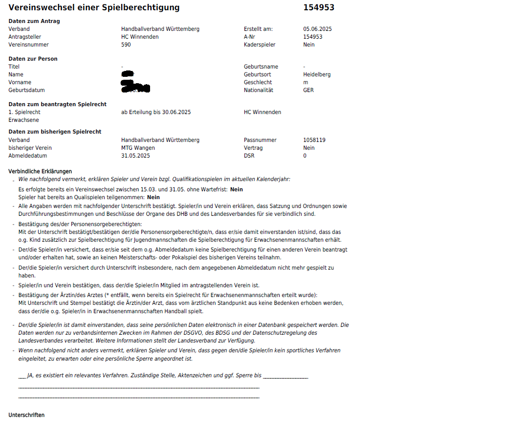 Der folgende Screenshot zeigt einen erzeugten Beispielantrag auf Vereinswechsel.
