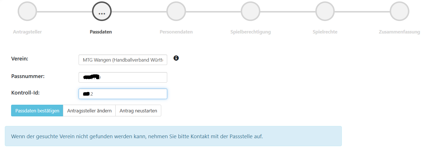 Danach kann über Klick des Buttons “Antrag ausfüllen” zum nächsten Schritt der Aktivität gesprungen werden. In diesem Schritt lassen sich die bisherigen Passdaten und der alte Verein erfassen.