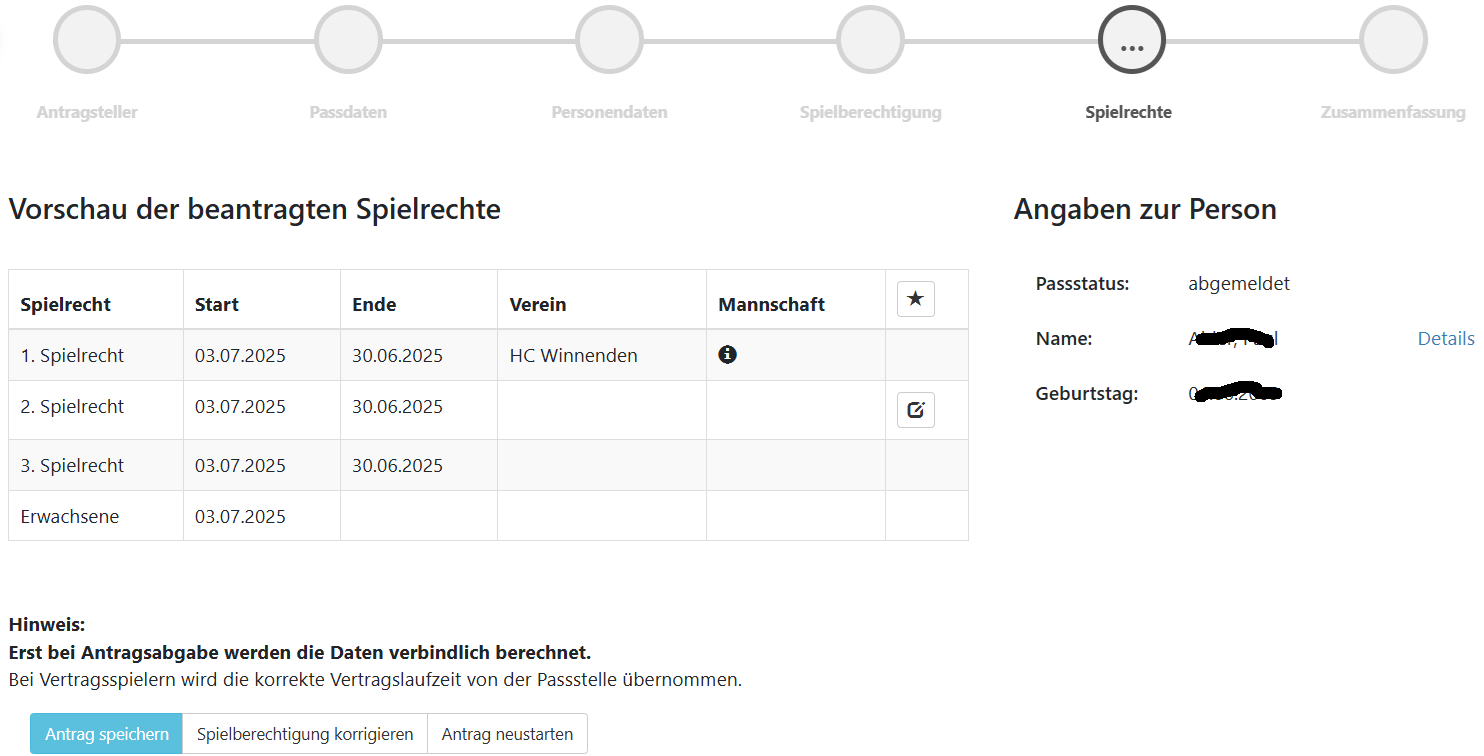 Die Richtigkeit der Personendaten muss über den Button “Personendaten bestätigen” quittiert werden. Damit geht es dann zum nächsten Schritt “Spielberechtigung”.